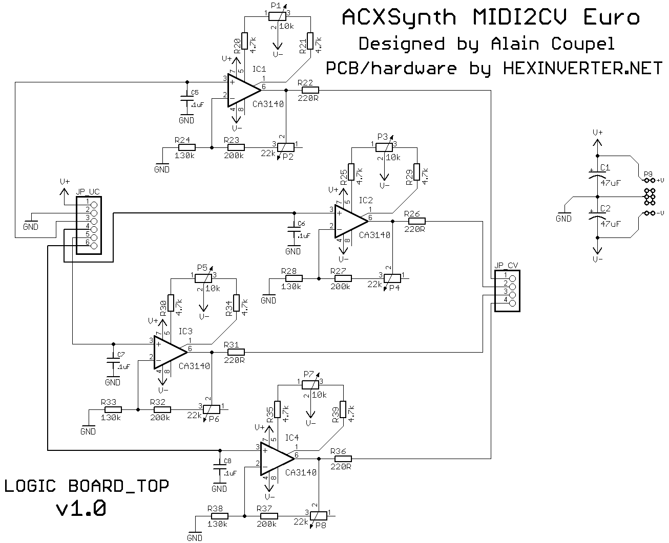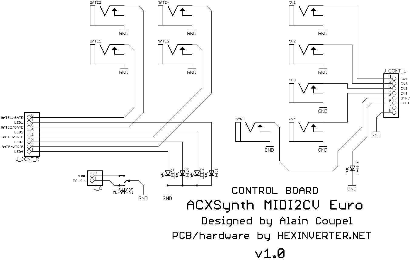 The ACXsynth MIDI2CV project was available as a DIY kit exclusively. Thanks to Alain Coupel for granting us permission to use his fantastic circuit ideas here! A huge, heartfelt thanks goes out to Dmitry of Modularsynth.ru for his work on the V5 firmware updates. If you like his work, you can donate to him at his link below. Also, you can find the firmware files for his version for download there.