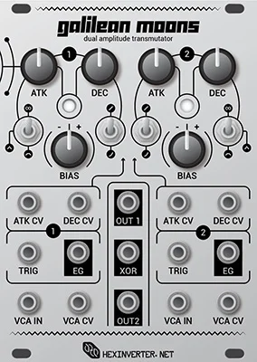 Galilean Moons is a dual amplitude transmutator. It transmutates the amplitude of incoming signals through the use of voltage controlled envelopes and VCAs. It is designed primarily to create voltage controlled percussive sounds when fed with a sound source (in particular, its sister module, Jupiter Storm), but can be used for all sorts of other tasks in your modular system as well as to generate typical synth sounds.